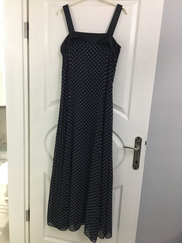 Fitted kesim, straplez yaka ve pileli detaylara sahip uzun siyah elbise, puantiye deseni ve sentetik kumaştan üretilmiştir.