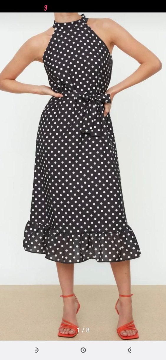 Siyah puantiye desenli uzun elbise, V yaka, askılı, bol kesim, etek ucu fırfırlı ve bel bağı detaylıdır. Günlük rahat sokak stili için uygundur.kalıbı geniştir