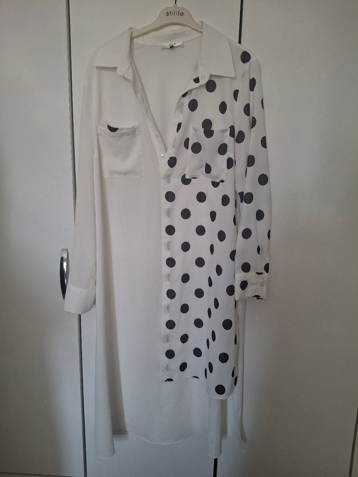 Uzun kollu, notlu yaka ve düğmeli uzun tunik. Beyaz ve siyah puantiye desenli, bol kesim. günlük kullanım için uygun. 40 42 bedenlere uygun. marka temsilidir