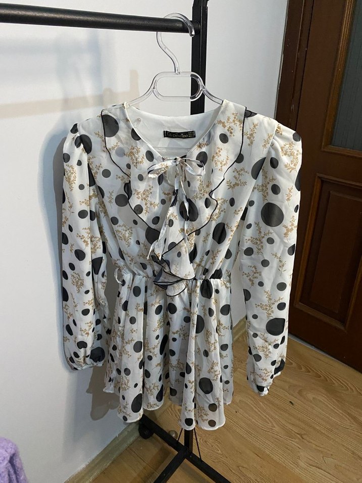 Uzun kollu, V yakalı, puantiye desenli ve fırfır detaylı bol kesim elbise. Gri ve beyaz renklerde, sentetik kumaştan üretilmiştir. Günlük kullanıma uygun bohem ve retro tarzda.