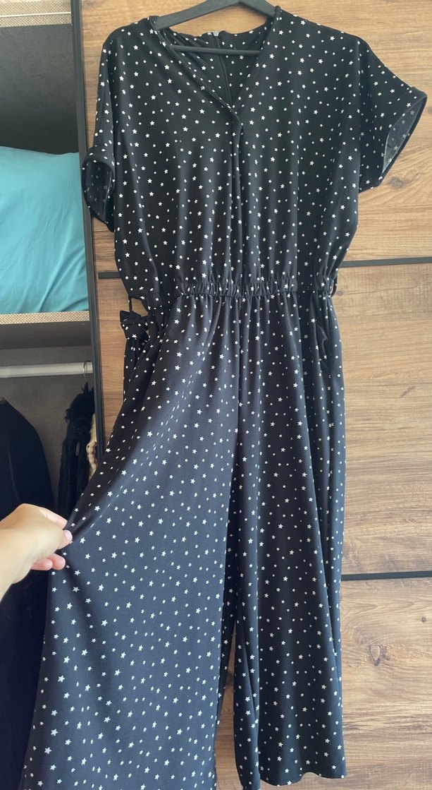 Siyah puantiye desenli hamile tulumu, V yaka ve askılı kollarla rahat kesime sahiptir. Yumuşak sentetik kumaştan üretilmiş, yan yırtmaçlıdır. Günlük kullanım için bohem Paris tarzı sunar.