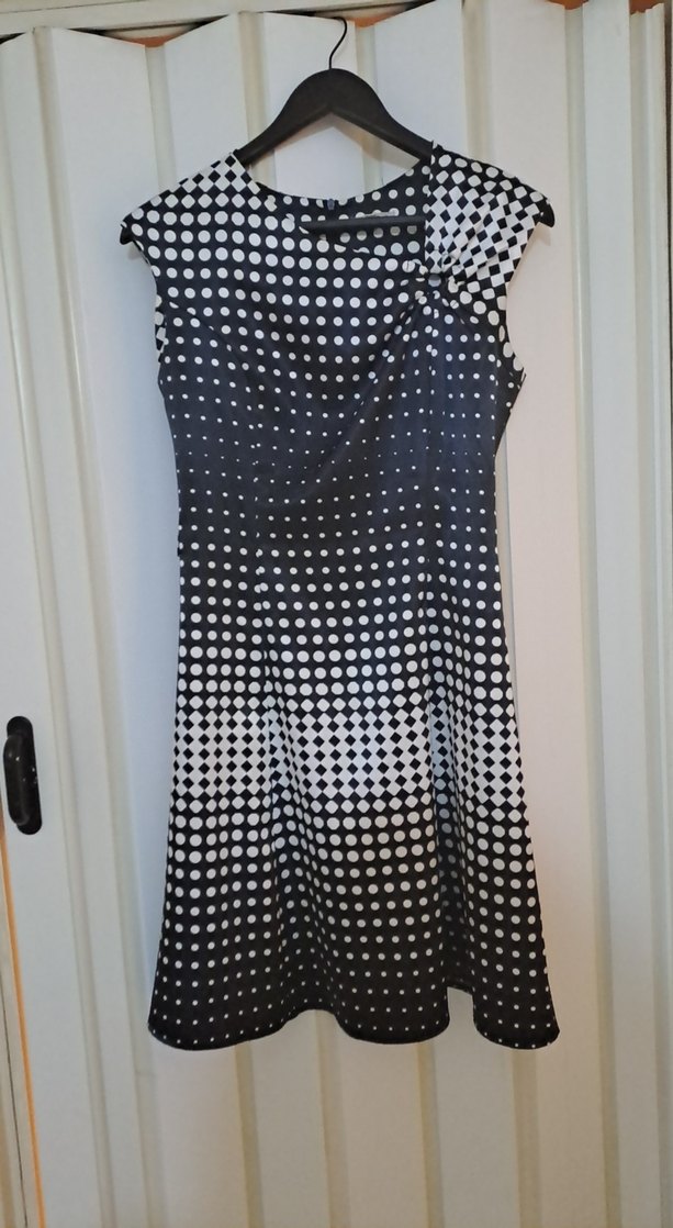 Kolsuz, V yakalı, diz boyu elbise. Siyah ve gri puantiye desenli, pileli tasarıma sahip, vücuda oturan kesim. Ofis için uygun, sentetik kumaştan.