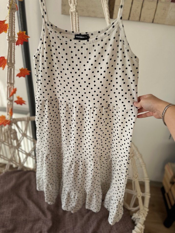 Pamuklu, beyaz ve gri puantiye desenli, V yakalı, kolsuz uzun ve bol kesim elbisedir. Fırfır detaylarıyla günlük sokak tarzına uygundur.