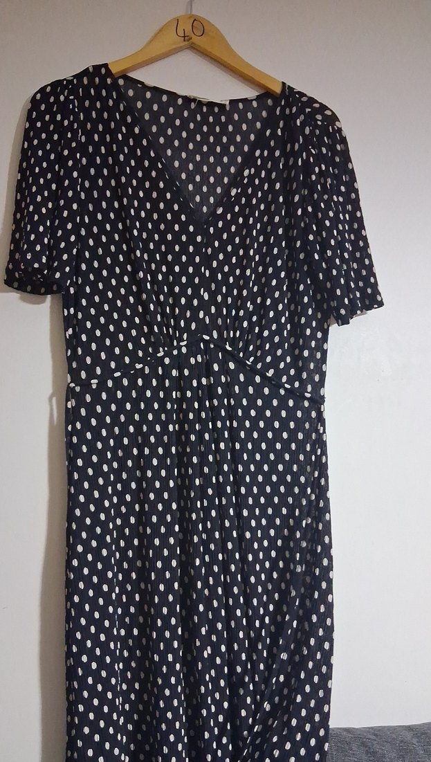 Uzun siyah elbise, v yaka ve düğme detaylı, puantiye desenli, kısa kollu ve vücuda oturan kesime sahip. Yumuşak sentetik kumaştan üretilmiştir.