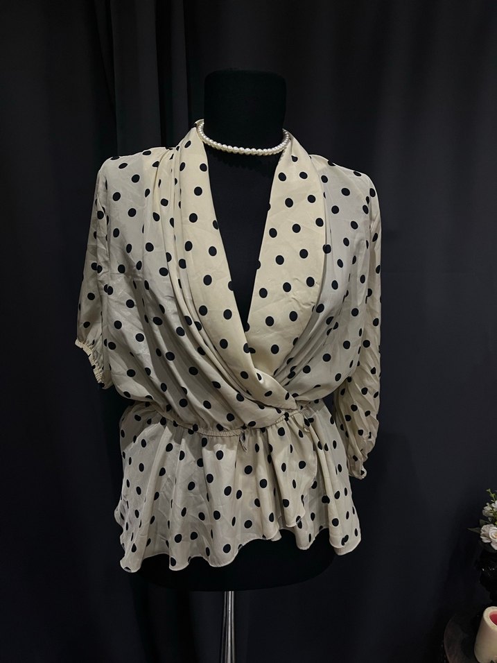 Siyah puantiye desenli, satenimsi bej bluz. V yakalı, uzun kollu, dökümlü ve bol kesim. Kısa uzunlukta, günlük kullanıma uygun retro tarzda.bir kolu kısa kol öteki kolu dirsekte model bu şekildedir