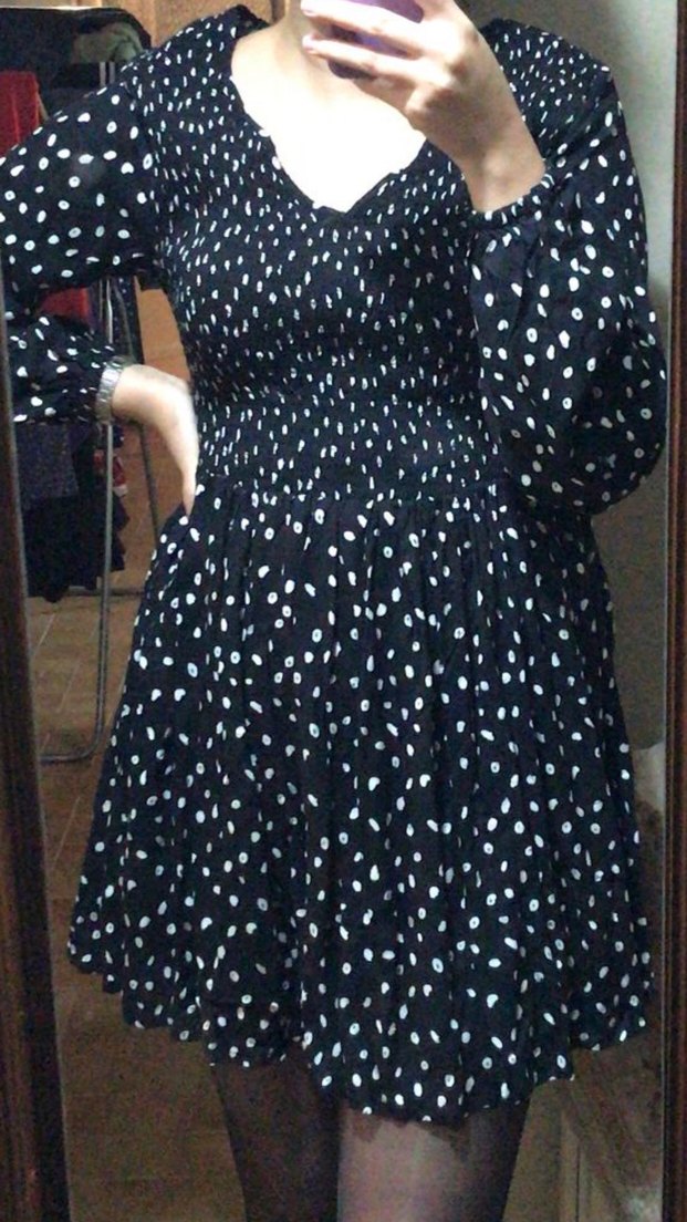 Siyah midi elbise, v yaka ve uzun kolludur. Puantiye desenli, pileli ve fitted kesimdir. Yumuşak sentetik kumaştan yapılmış, günlük kullanıma uygundur. Sadece 1 kez giyildi