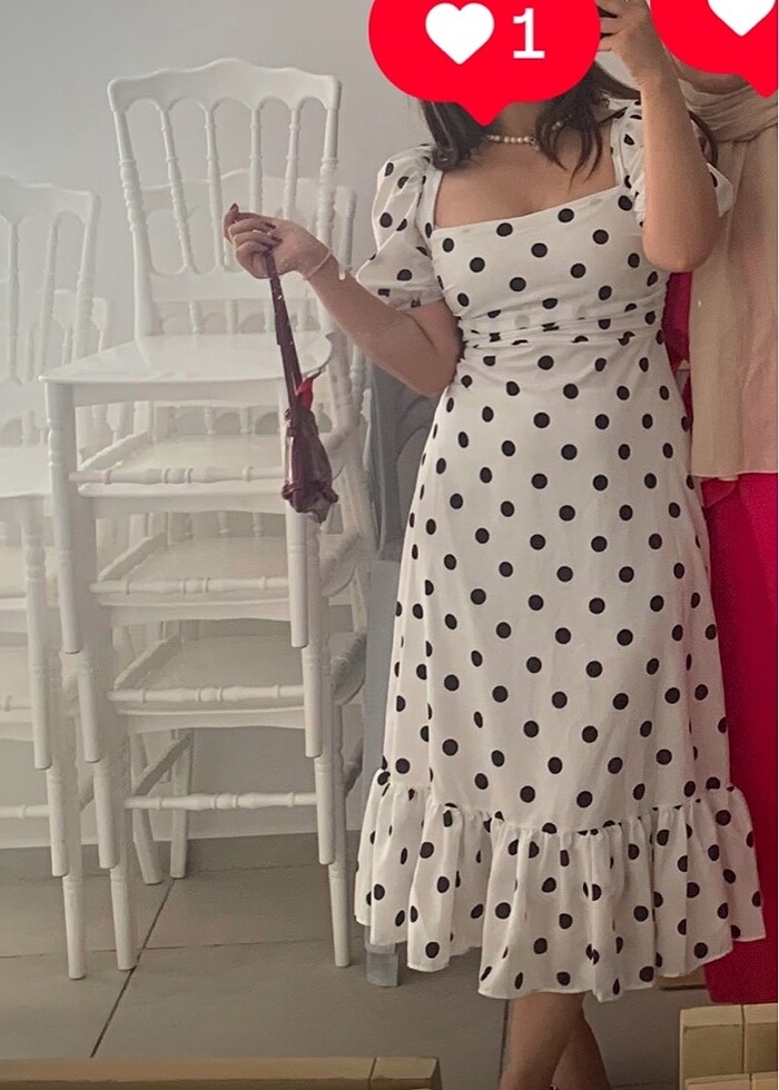 Puantiyeli beyaz elbise. Balon kol midi boy