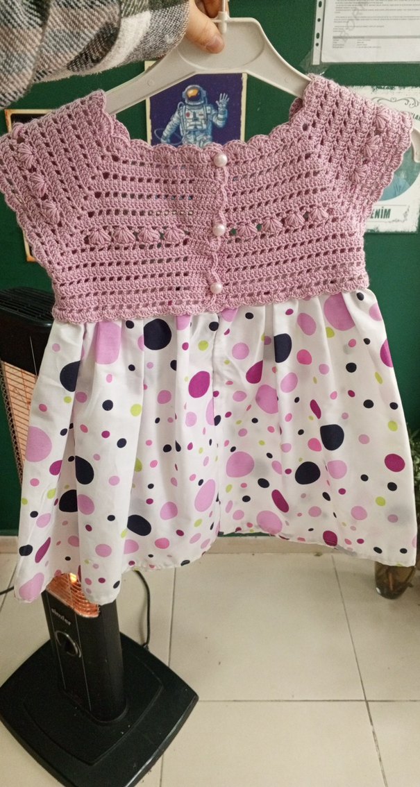 Dantel detaylı örme üst kısmı ve pastel puantiyeli etek kısmı olan, kolsuz, bol kesim, straplez yakalı bohem tarz kız elbisesi.