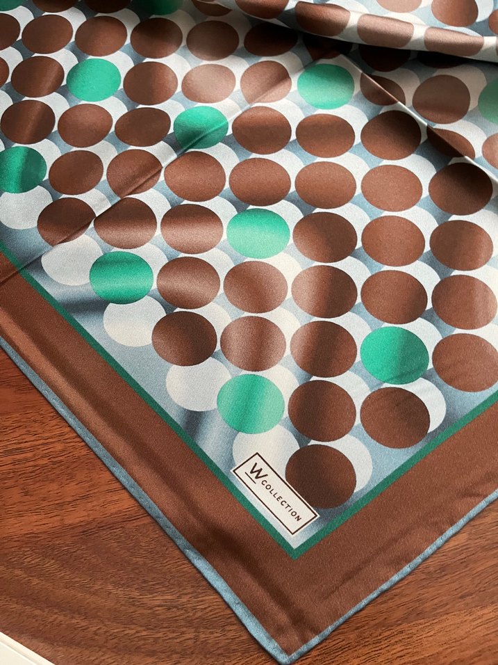 Kadınlar için koyu kahverengi zeminli, beyaz ve turkuaz puantiyeli retro stil eşarp.Yumuşak dokulu kumaştan, enerjik bir görünüm sağlar.