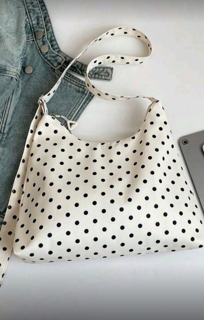 Beyaz puantiyeli beyaz kumaş kadın çantası, fermuarlı kapanışlıdır ve günlük sokak stiline uygundur , puantiyeli omuz cantası geniş