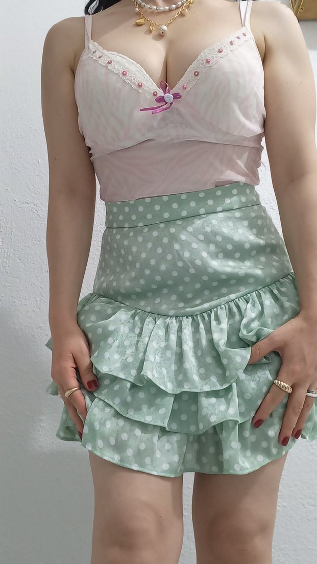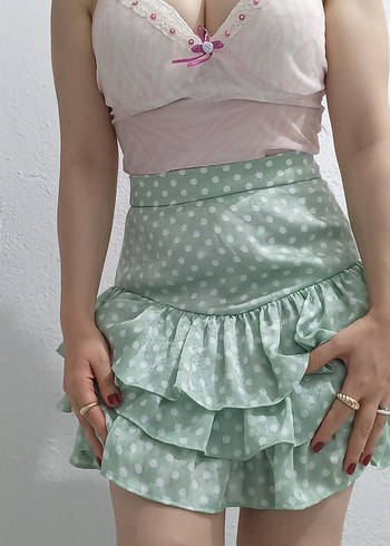 Pamuklu kumaştan, pastel yeşil puantiyeli ve fırfırlı, bohem tarzda, vücuda oturan midi etek. Şort etek içinde şortu var