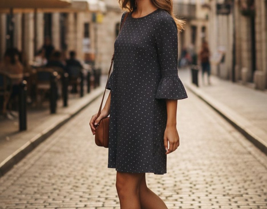 Siyah ve gri puantiyeli, uzun fırfırlı kollu, yuvarlak yakalı, bol kesim midi elbise. Günlük kullanım için uygundur.