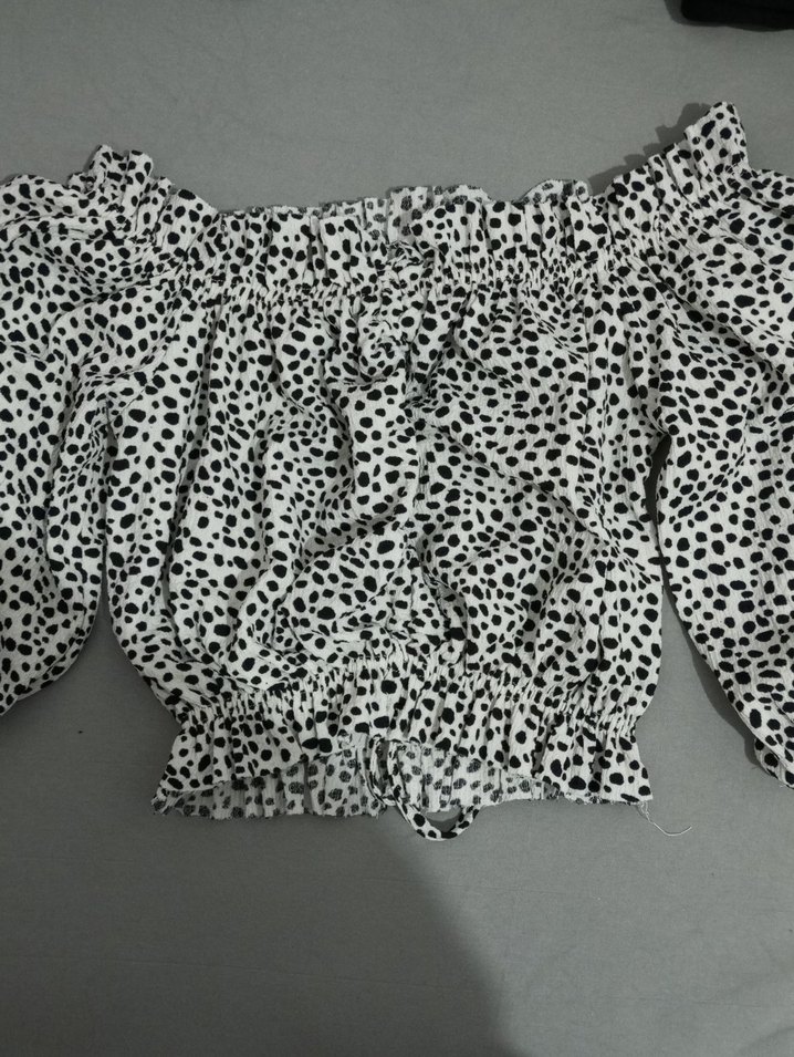 Beyaz, tekne yaka ve kısa kollu bu bluz, vücuda oturan kesimi ve fırfır detaylarıyla dikkat çeker. Gri puantiyeli deseniyle retro ve minimalist tarzı yansıtır.