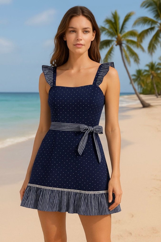 Koton marka puantiyeli mini elbise. Fırfırlı askıları ve belde bağlama detaylı