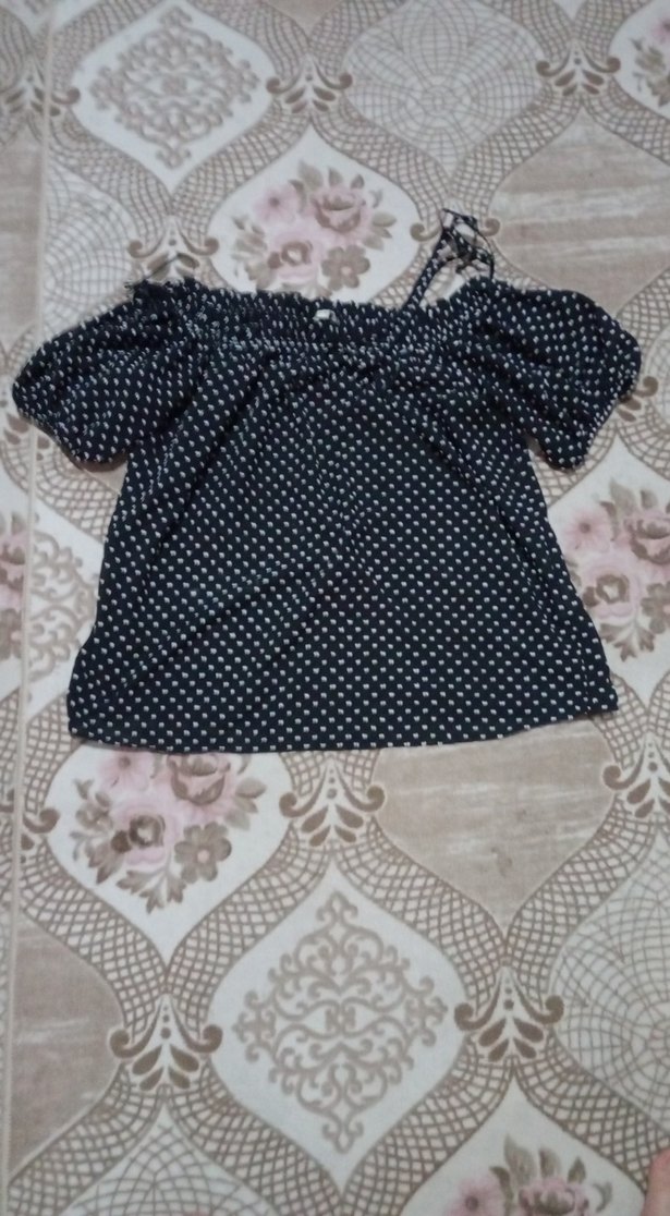 Kısa kollu, kayık yaka ve bol siyah bluz. Vintage puantiyeli desene ve fırfır detayına sahip, şık ve rahat bir model.