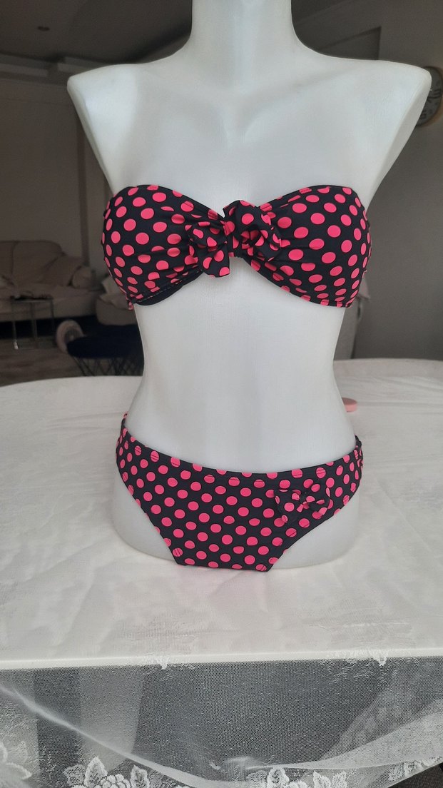 Üst 36 beden. alt 38 beden Fiyonk detaylı, koyu pembe puantiyeli, kısa kesim ve straplez tasarımlı retro pop kültür tarzında mini bikini. ingiltereden aldım.