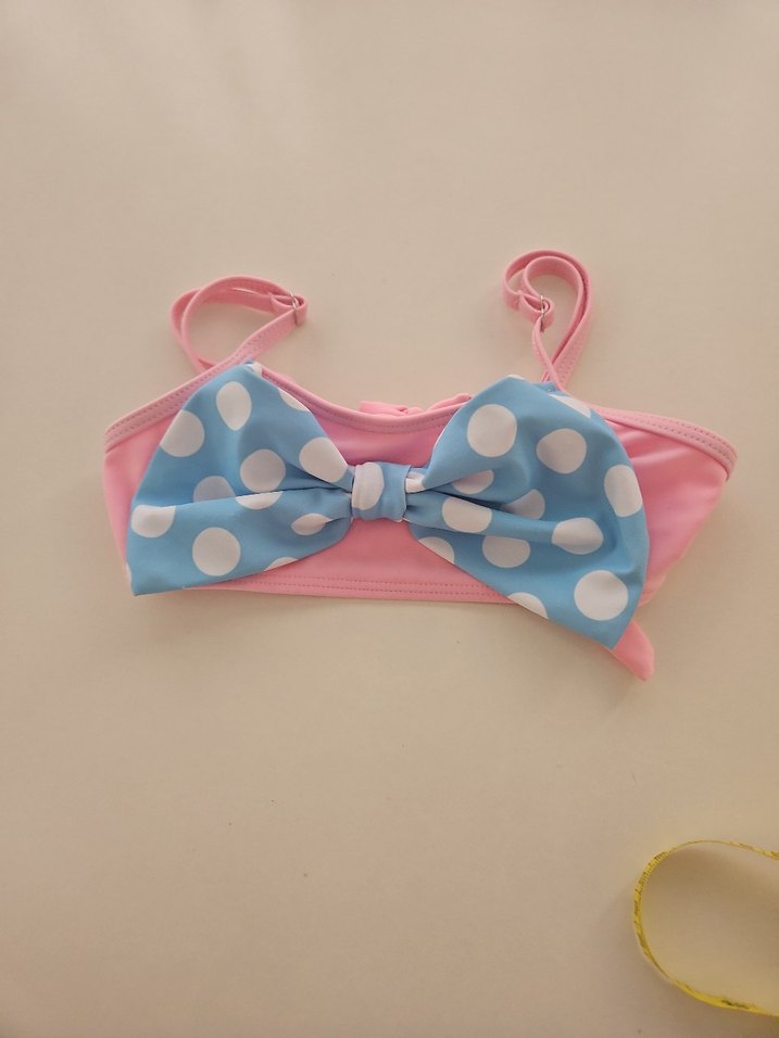 Pembe renkli, ince askılı bikini üstü, büyük mavi puantiyeli fiyonk detayıyla plaj için uygundur.