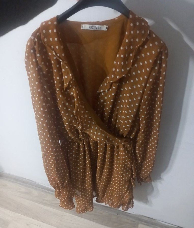 Kahverengi hamile elbise uzun kollu, V yakalı ve bol kesimdir. Parlak puantiyeli deseni ve fırfır detaylarıyla bohem tarzı sunar. Sentetik kumaştan yapılmıştır. l bedendircama m bedene daha salaş vd güzel durur