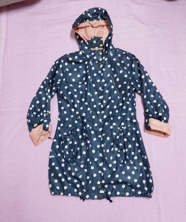 Kapüşonlu, düğmeli ve bol kesimli yağmurluk, renkli mavi puantiyeli desene sahiptir. Sentetik kumaştan yapılmıştır, trend sokak stili için uygundur. ️