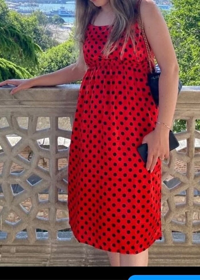 Uğur böceği gibi. 2 3 kez giyindim. Medium beden iyi durumda. Parlak satenimsi bir kumaşı var. Midi boy