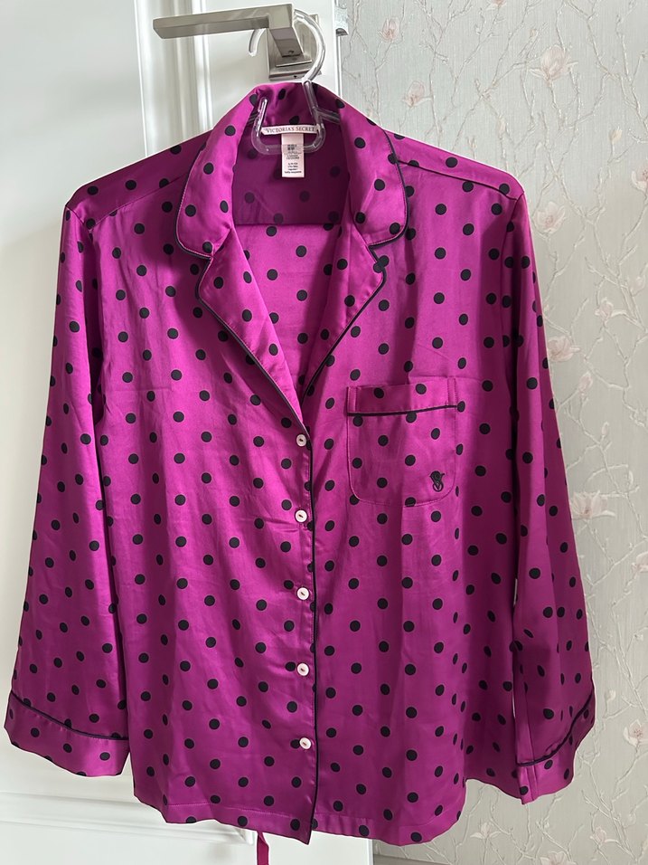 Parlak pembe zemin üzerine siyah puantiyeli, uzun kollu, normal midi uzunlukta, bol kesim kadın pijama üstü.