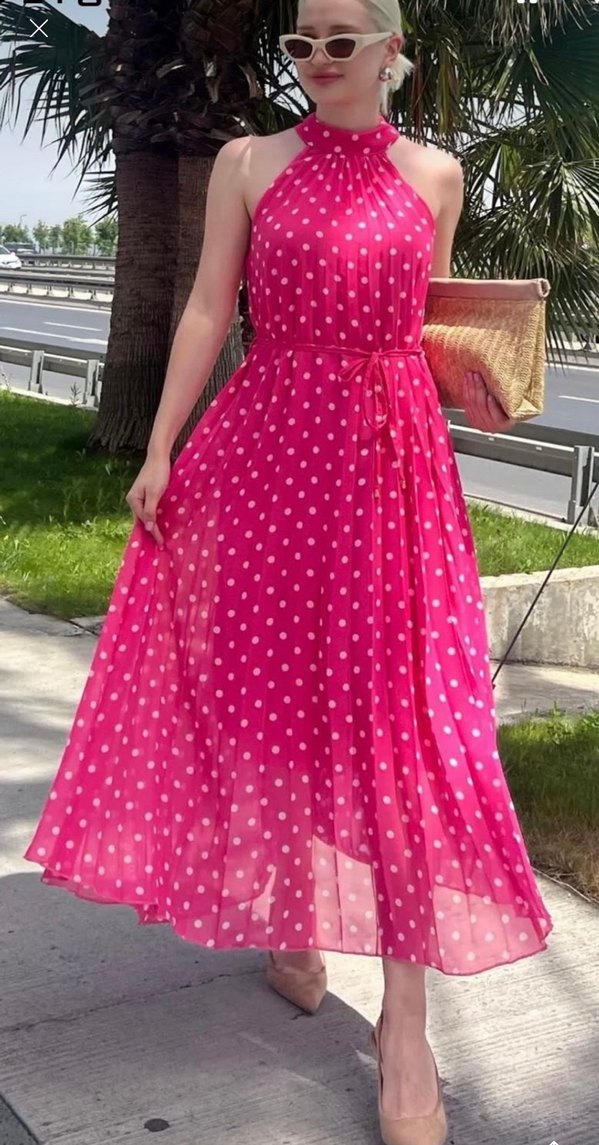 Renkli pembe uzun elbise, askısız yakası, pileli detayı ve bol kesimi ile dikkat çeker. Puantiyeli deseni ve yumuşak sentetik kumaşından yapılmıştır, düğünler için uygundur. Sadece 1 kere giyildi tertemiz