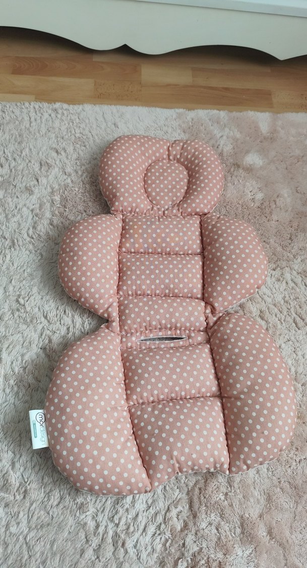 Pastel pembe renkte, puantiyeli desene sahip bebek destek minderi, yumuşak sentetik kumaştan üretilmiştir ve konfor sağlar.