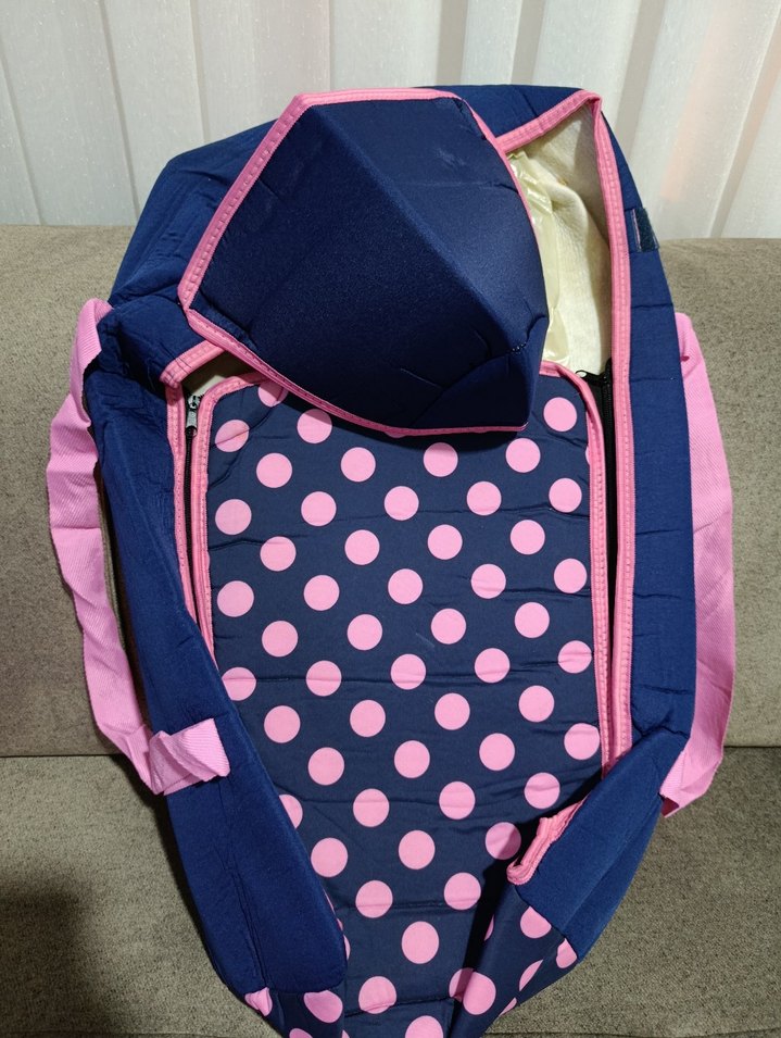 Renkli pembe puantiyeli baskılı, yumuşak ve dolgulu bebek taşıma çantasıdır.