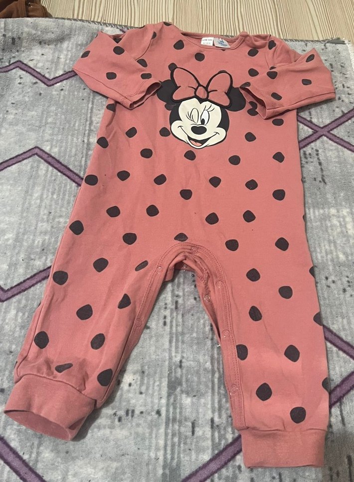 Pembe renkli, puantiyeli ve Minnie Mouse baskılı bebek tulumu. Uzun kollu ve düğmeli, kolay giydirme sağlar.