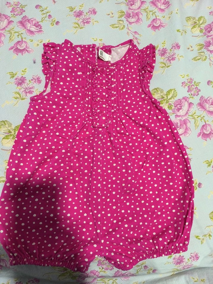 Renkli pembe kumaş üzerinde beyaz puantiyeler ve önde, omuzlarda fırfır detayları bulunan bebek tulumu. Bacaklarda lastik bulunur. sıfır hiç kullanılmamış tertemizdir