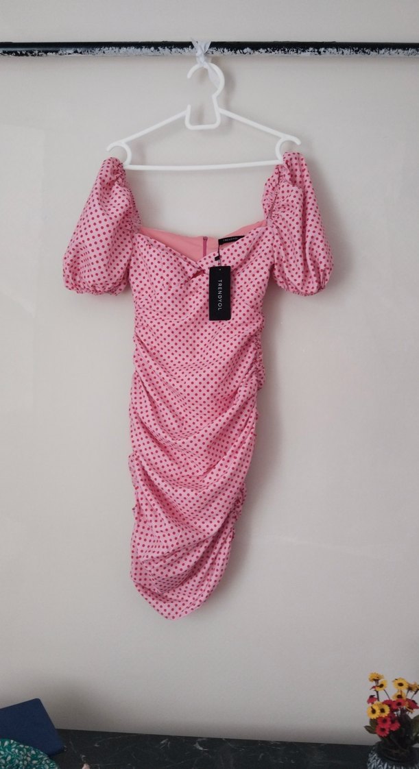 Puantiyeli desende, drapeli tasarıma sahip pembe mini elbise. V yaka ve kısa balon kollu, vücuda oturan kesim. Pürüzsüz sentetik kumaştan üretilmiştir. Romantik akşamlar için uygun.
