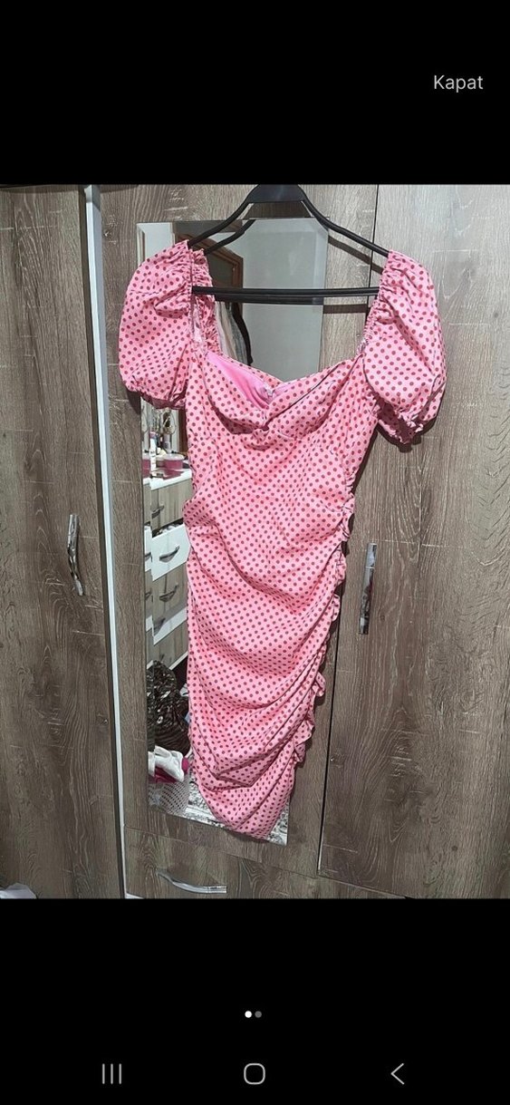 Pembe puantiyeli, drapeli, kısa ve fitted mini elbise. V yaka ve askılı kollu, vintage bohem tarzında parti elbisesi..İsteyene hem ölçü hem özelden manken üzerinde resim atabilirim