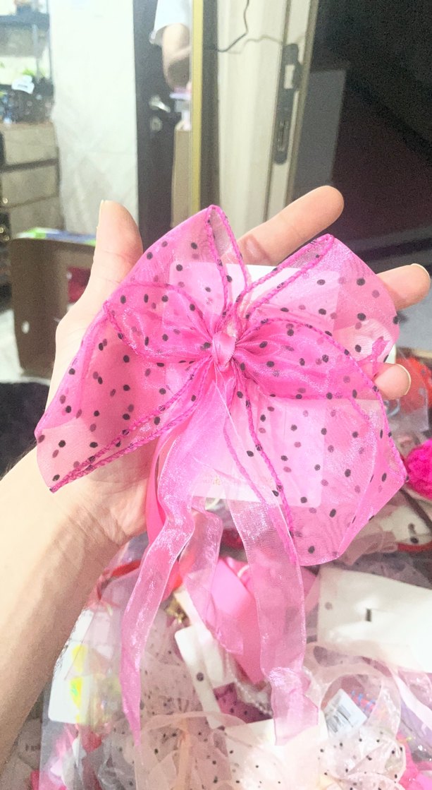 Puantiyeli, büyük pembe fiyonk şeklinde şeffaf kumaştan yapılmış saç aksesuarı. Saçlara renkli ve göz alıcı bir dokunuş katar.