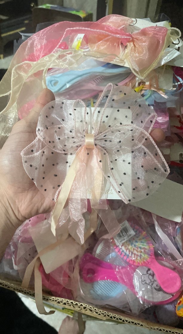 Pastel pembe renkte, puantiyeli baskılı büyük fiyonk şeklinde, bohem tarzda çocuk saç aksesuarı. Saçlara şık bir dokunuş katar.