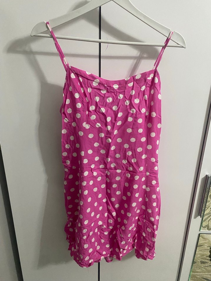 İnce askılı, straplez yakalı ve fırfırlı detaylı, vücuda oturan pembe mini elbise. Pastel puantiyeli yumuşak sentetik kumaştan yapılmıştır.