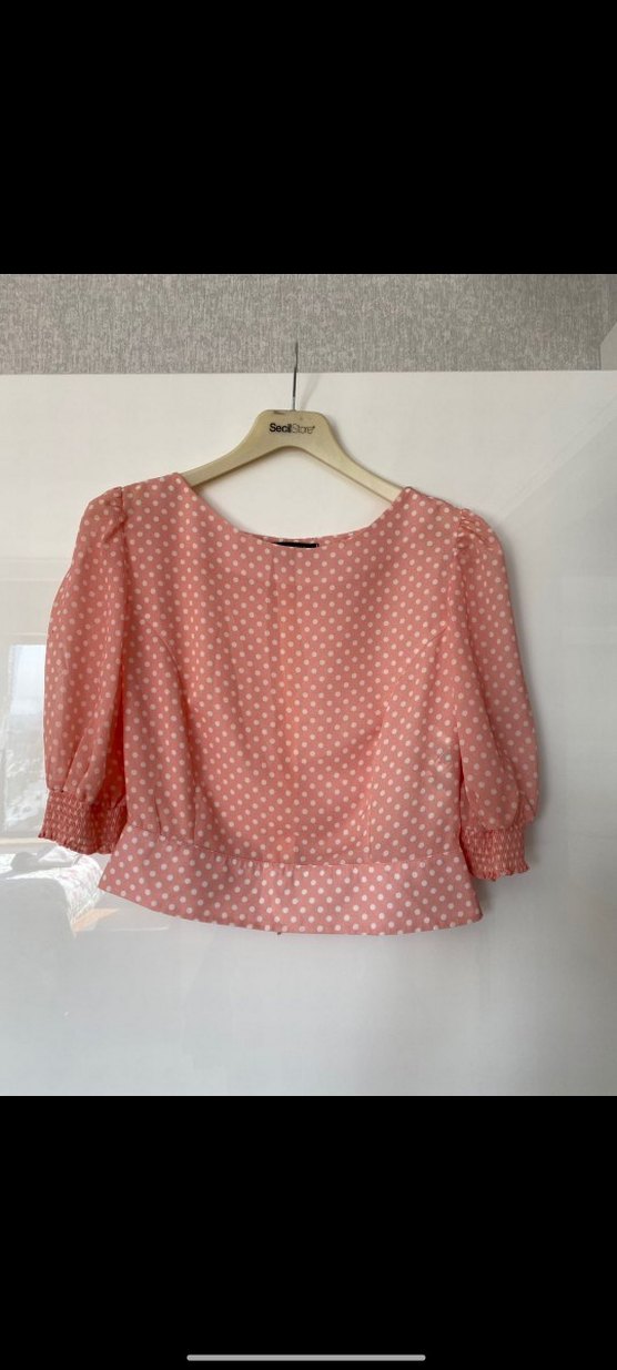 Pembe renkli, yuvarlak yakalı ve kısa kollu, puantiyeli desenli, bol kesim kısa boyda bluz. Sentetik kumaştan, sokak stili için uygun.