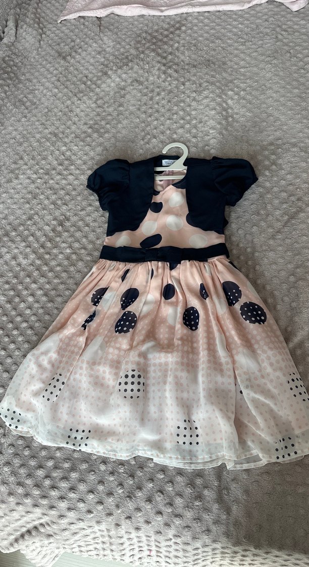 Pembe tonlarda, siyah puantiyeli, straplez yaka ve fırfırlı detaylara sahip, kısa kollu kız çocuk elbisesi. Modern klasik tarzda, yumuşak sentetik kumaştan üretilmiştir.