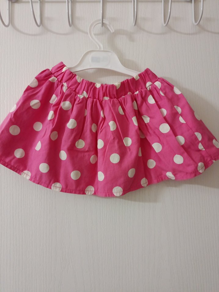 Renkli pembe etek, beyaz puantiyeler ve bol kesim ile fırfırlı detaylara sahiptir. Yumuşak sentetik kumaştan yapılmış, kızlar için eğlenceli pop kültür tarzı sunar. kalıbı geniş 2 sene giyilir. sorunu yok