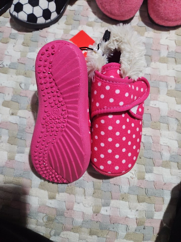 Renkli puantiyeli pembe kız çocuk terliği, cırt cırtlı ve kauçuk tabanlı. İç kısmı yumuşak ve sıcak tutar.
