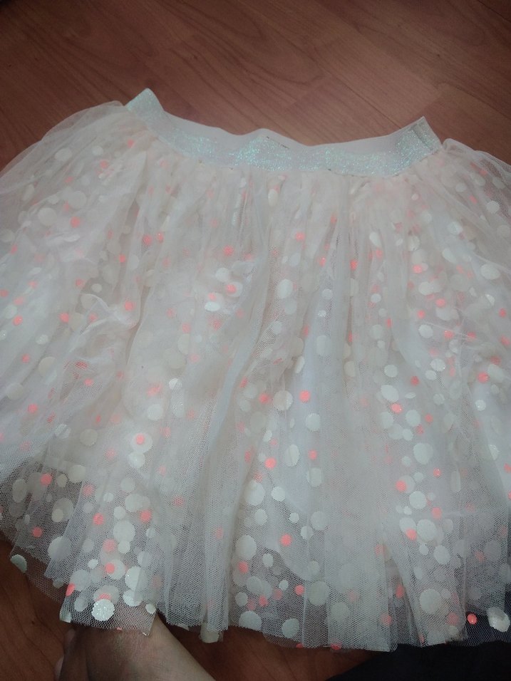 Puantiyeli ve fırfırlı, pastel pembe tonlarında, bol kesim kız çocuk eteği, yumuşak sentetik kumaştan, bohem tarzında.