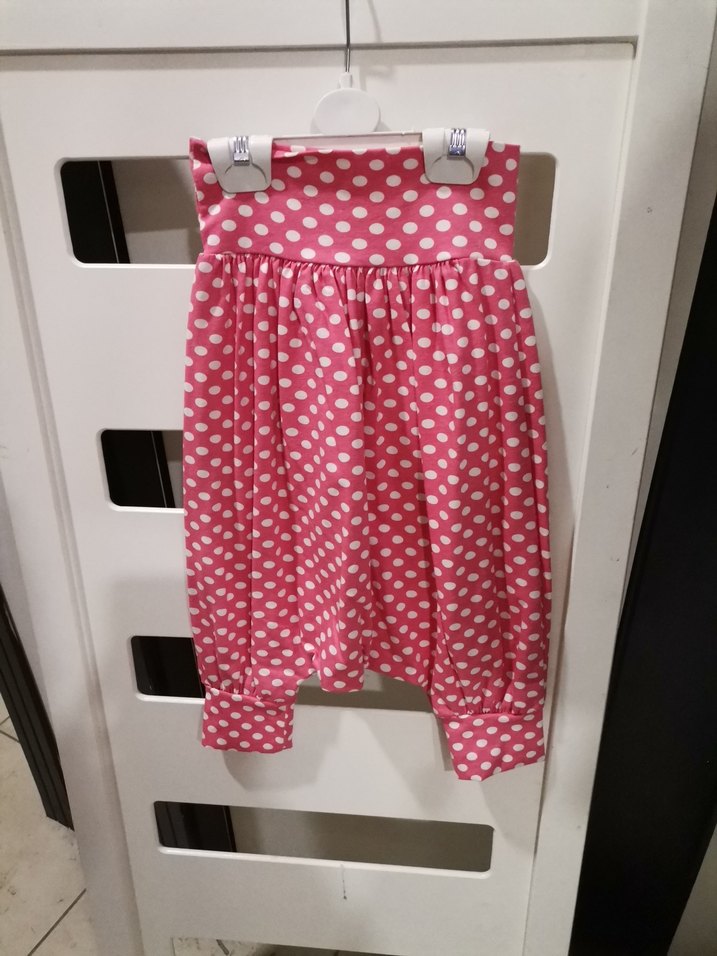 Pamuklu, bol kesim, beyaz puantiyeli pembe kız şalvarı , pileli detaylarla renkli bohem tarzını yansıtıyor. 1-2-3-4-5 yaş