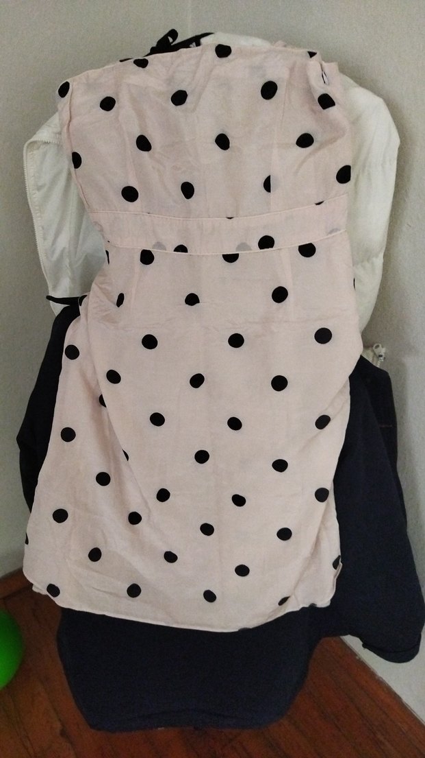 Pembe pastel renkte, siyah puantiyeli, düğmeli ve vücuda oturan midi hamile eteği, günlük sokak stiline uygundur.