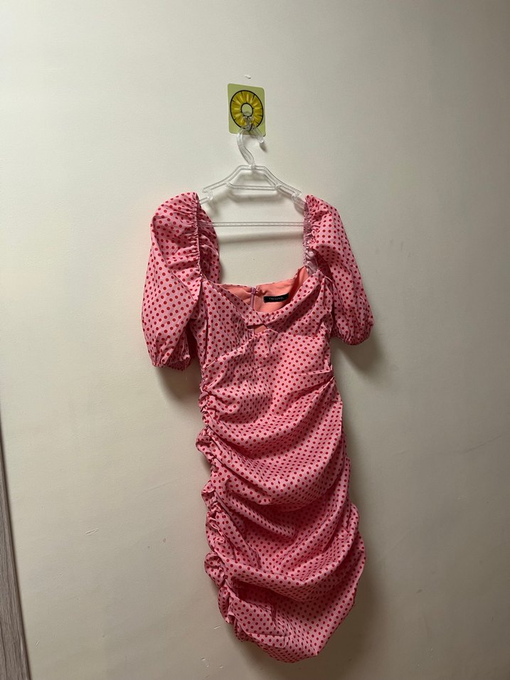 Puantiyeli, pembe mini elbise, drapeli tasarımı, askılı kollar ve V yaka ile sokak modasına uygun.