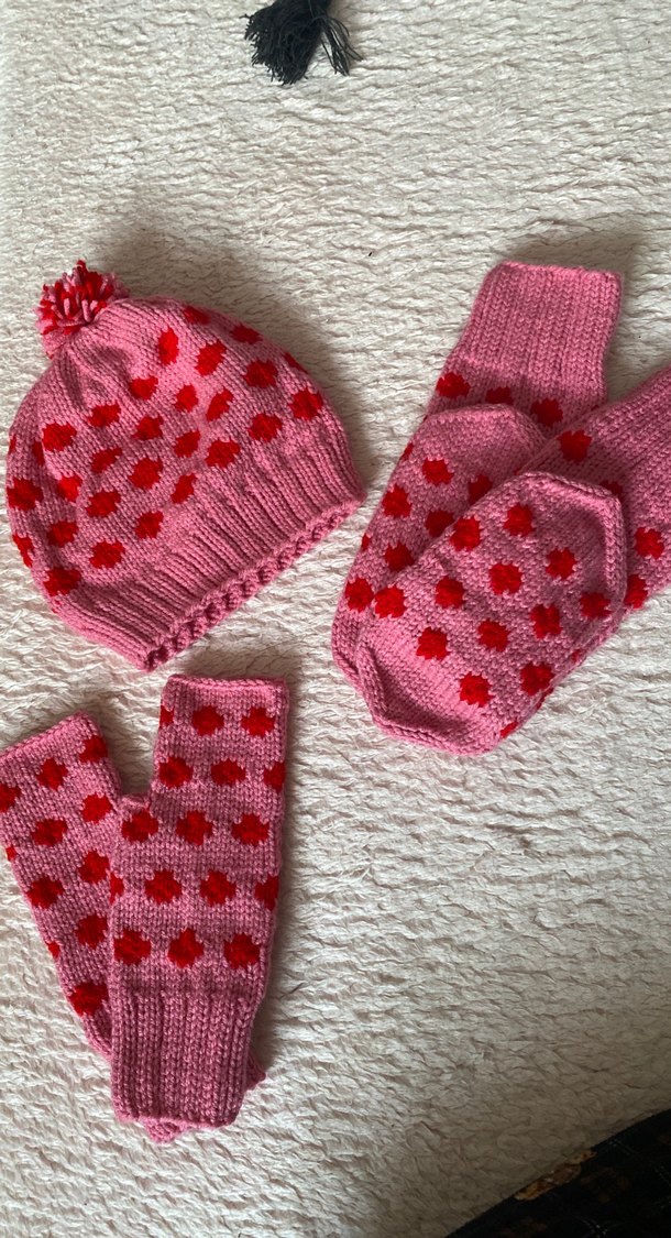 Renkli pembe örgü kadın bere ve ponponlu şapka ile uyumlu puantiyeli eldiven seti. Sıfırdır