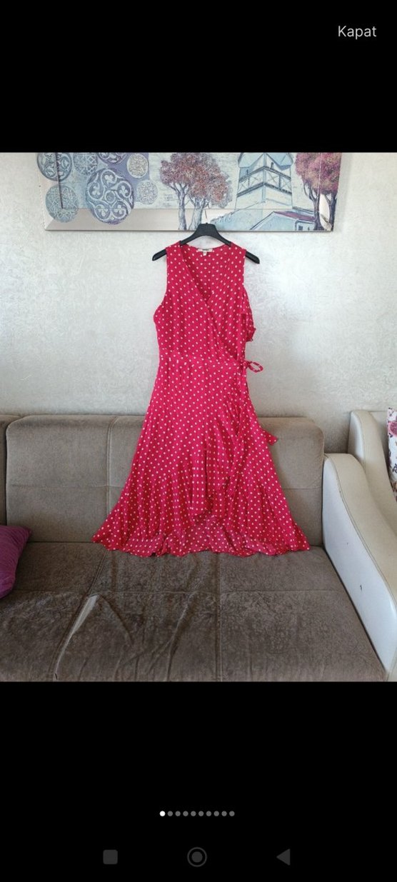 V yaka, kolsuz, fırfırlı detaylara sahip uzun elbise. Canlı pembe puantiyeli desenli, sentetik kumaştan, bol kesim. Günlük kullanım için vintage bohem tarzda.