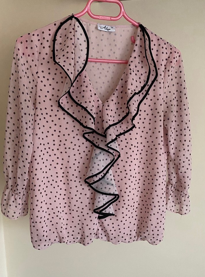 Puantiyeli, V yaka ve fırfırlı detaylara sahip pastel pembe kadın bluz. Uzun kollu, kısa boylu ve bol kesimdir. Bohem tarzda günlük kullanım için uygundur. Görselde görüldüğü gibidir