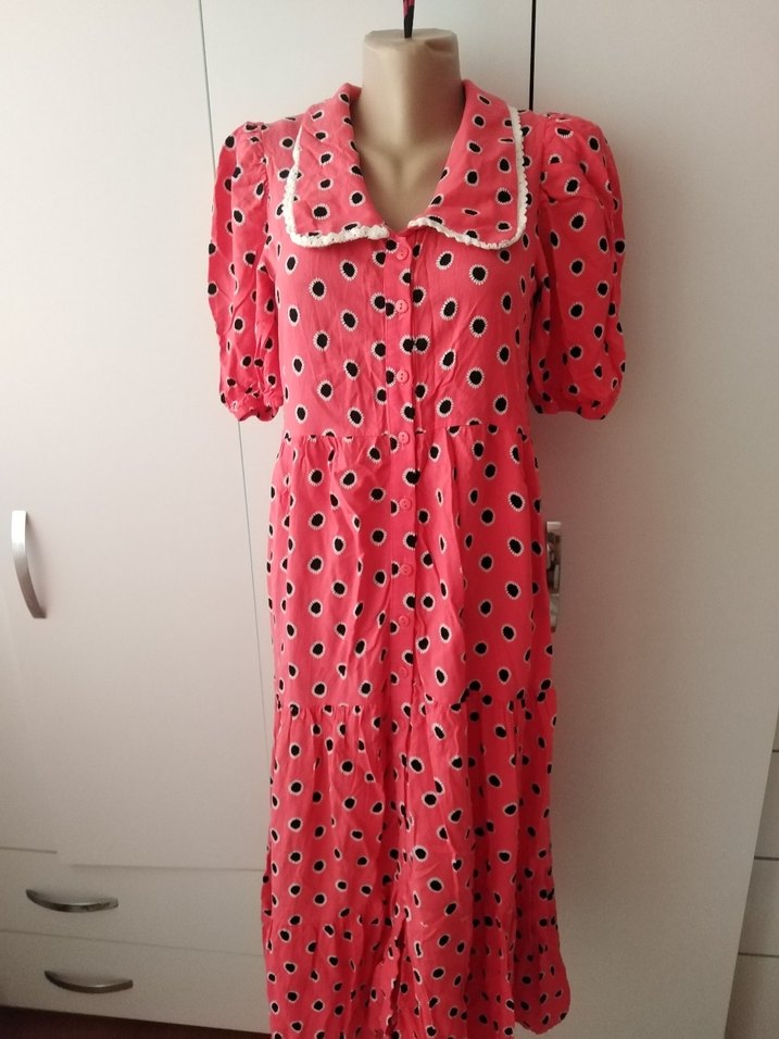 Renkli pembe puantiyeli, düğmeli, yakalı ve kısa kollu, bol kesim uzun elbise. Yumuşak sentetik kumaştan yapılmış, vintage bohem tarzını yansıtıyor.