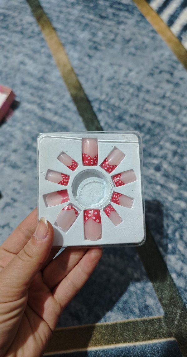 uçları beyaz puantiyelerle süslenmiş, eğlenceli tasarıma sahip basılabilir tırnak seti.