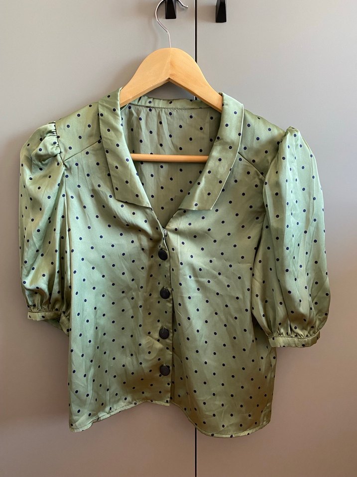 V yaka, düğmeli, kısa kabarık kollu, pastel puantiyeli, saten görünümlü kadın gömleği. Rahat ve günlük kullanım için uygun.