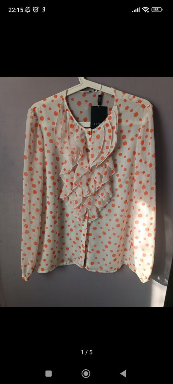 Turuncu puantiye desenli açık beyaz bluz, uzun kollu ve ön kısmında fırfırlı detaylı. Salaş kesim, yuvarlak yaka ve kısa boyda, günlük rahat sokak tarzı için uygundur. Yumuşak sentetik kumaştan yapılmıştır.